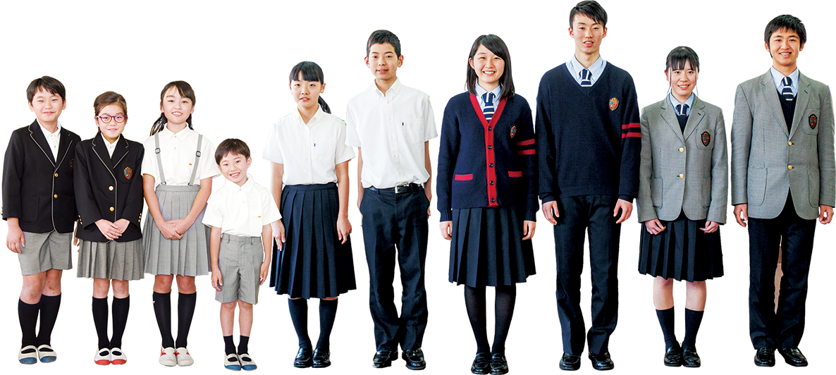 小学校は、紺色のジャケットに千鳥格子柄の半ズボンとプリーツスカートを合わせ、活発な子ども達に落ち着きのある印象を与えます。 ジャケットには衿端を、ボトムと同じ柄で縁取ることで全体の統一感を高めるとともに子どもらしさを演出しています。