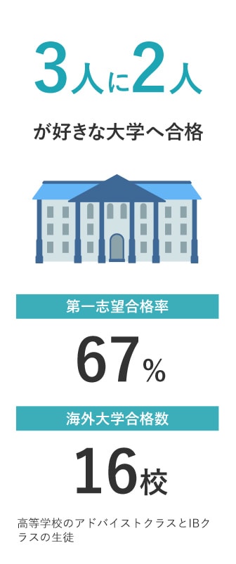 Times Higher Educationが発表するTHE世界大学ランキングは世界で最も利用されている大学ランキングと言われ、「教育力」「研究力」「論文の引用数(研究の影響力)」「国際性」「産業界からの収入」という5分野、13の指標をもとに順位付けがされています。わたしたち英数学館では、不確実なグローバル社会の中で自分らしさを大切に生きていく生徒を育成したいとの思いから、学業においては上記ランキングを1つの指標にしています。生徒の第一志望に合格できるように学校全体で進学指導を行っています。大学入試制度の変革を迎える中で、探究的な学習スタイルが定着するとともに、偏差値だけでなく、学びたいことを学べる大学に進学したいという姿勢が目立つようになりました。また高等学校IBクラスの生徒を中心として海外の大学への合格・進学の幅も広がりをみせています。