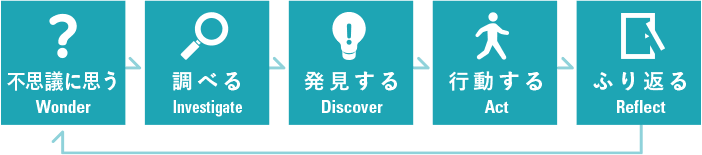 「探究モデル」に基づいて学習が進められます。このようなサイクルを繰り返すことによって子どもたちは、自分たちの学びや理解を広げたり、深めたりしていきます。